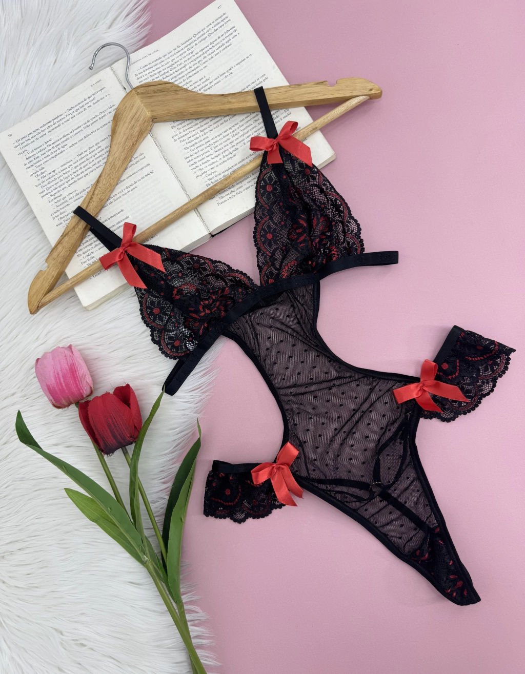 Body em tule e renda, com alça regulável no quadril e detalhes de babado e laços. É fio dental na parte de trás.